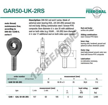 Das Gelenklager Ge bekannt als GAR50-UK-2RS-DURBAL DURBAL hat einen Innendurchmesser von 50 mm, einen Außendurchmesser von 112 mm und einer Dicke von 35 mm.