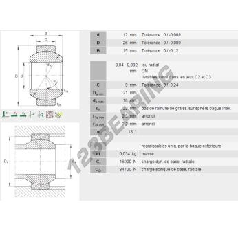 Das Gelenklager Ge bekannt als GE12-FO-INA INA hat einen Innendurchmesser von 12 mm, einen Außendurchmesser von 26 mm und einer Dicke von 15 mm.