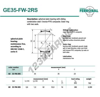 Das Gelenklager Geew bekannt als GE35-FW-2RS-DURBAL DURBAL hat einen Innendurchmesser von 35 mm, einen Außendurchmesser von 62 mm und einer Dicke von 23 mm.