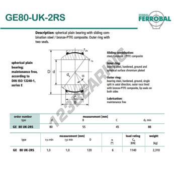 Das Gelenklager Geew bekannt als GE80-UK-2RS-DURBAL DURBAL hat einen Innendurchmesser von 80 mm, einen Außendurchmesser von 120 mm und einer Dicke von 45 mm.