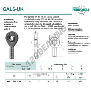 Die Gelenkkopf Sa bekannt als DGAL6-UK-DURBAL DURBAL, hat eine Gewindesteigung von , einen Innendurchmesser von 6 mm, einen Außendurchmesser von 21 mm und eine Dicke von 6 mm.