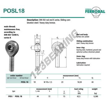 Die Gelenkkopf Sa bekannt als POSL18-DURBAL DURBAL, hat eine Gewindesteigung von , einen Innendurchmesser von 18 mm, einen Außendurchmesser von 44 mm und eine Dicke von 23 mm.
