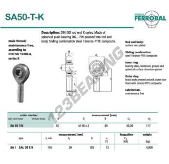 Die Gelenkkopf Sa bekannt als SA50-T-K-DURBAL DURBAL, hat eine Gewindesteigung von , einen Innendurchmesser von 50 mm, einen Außendurchmesser von 117 mm und eine Dicke von 60 mm.