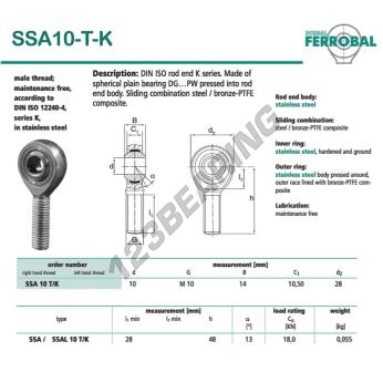 Die Gelenkkopf Sa bekannt als SSA10-T-K-DURBAL DURBAL, hat eine Gewindesteigung von , einen Innendurchmesser von 10 mm, einen Außendurchmesser von 28 mm und eine Dicke von 14 mm.