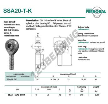 Die Gelenkkopf Sa bekannt als SSA20-T-K-DURBAL DURBAL, hat eine Gewindesteigung von , einen Innendurchmesser von 20 mm, einen Außendurchmesser von 50 mm und eine Dicke von 25 mm.
