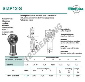 Das Gelenkköpfe Si bekannt als SIZP12-S-DURBAL DURBAL hat einen Innendurchmesser von 12.7 mm, einen Außendurchmesser von 33.32 mm und einer Dicke von 15.88 mm.