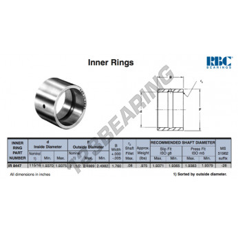 Das Innenringe bekannt als IR8447-RBC RBC, hat einen Innendurchmesser von 49.213 mm, einen Außendurchmesser von 63.5 mm und eine Länge von 44.704 mm. Sie wird aus hergestellt.