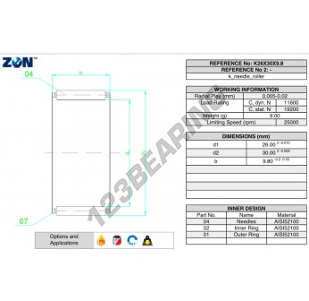 Das Nadelkränze , bekannt als K26-30-9.80-ZEN ZEN, hat einen Innendurchmesser von 26 mm, einen Außendurchmesser von 30 mm und eine Dicke von 9.8 mm.