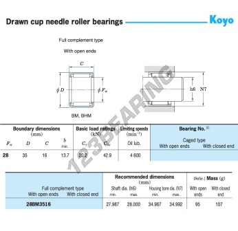 Das Axial-nadellager , bekannt als 28BM3516-JTEKT JTEKT, hat einen Innendurchmesser von 28 mm, einen Außendurchmesser von  35 mm und eine Dicke von 16 mm.