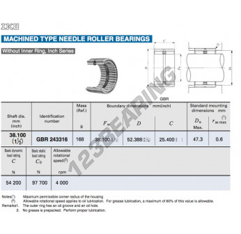 Das Axial-nadellager , bekannt als GBR243316-IKO IKO, hat einen Innendurchmesser von 38.1 mm, einen Außendurchmesser von 52.388 mm und eine Dicke von 25.4 mm.