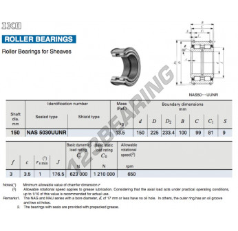 Das Axial-nadellager , bekannt als NAS5030-UU-NR-IKO IKO, hat einen Innendurchmesser von 150 mm, einen Außendurchmesser von  255 mm und eine Dicke von 100 mm.