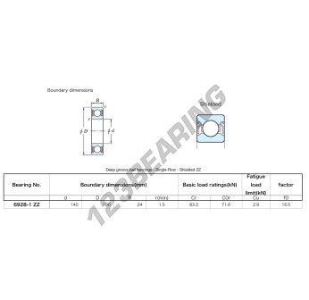 Das Rillenkugellager, bekannt als 6928-1-ZZ-JTEKT JTEKT, hat einen Innendurchmesser von 140 mm, einen Außendurchmesser von 190 mm und eine Dicke von 24 mm.