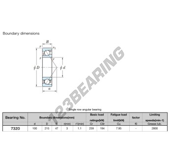 Das Rillenkugellager, bekannt als 7320-JTEKT JTEKT, hat einen Innendurchmesser von 100 mm, einen Außendurchmesser von 215 mm und eine Dicke von 47 mm.