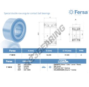 Das Rillenkugellager, bekannt als F16019-ASFERSA ASFERSA, hat einen Innendurchmesser von 34 mm, einen Außendurchmesser von 64 mm und eine Dicke von 37 mm.