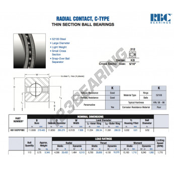 Das Rillenkugellager, bekannt als KB110-CP0-RBC RBC, hat einen Innendurchmesser von 279.4 mm, einen Außendurchmesser von 295.275 mm und eine Dicke von 7.938 mm.