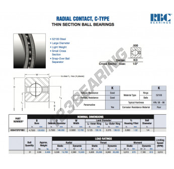 Das Rillenkugellager, bekannt als KD047-CP0-RBC RBC, hat einen Innendurchmesser von 120.65 mm, einen Außendurchmesser von 146.05 mm und eine Dicke von 12.7 mm.