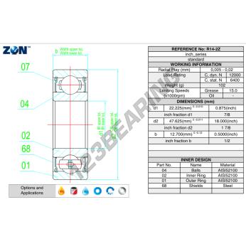 Das Rillenkugellager, bekannt als R14-2Z-ZEN ZEN, hat einen Innendurchmesser von 22.2 mm, einen Außendurchmesser von 47.6 mm und eine Dicke von 12.7 mm.