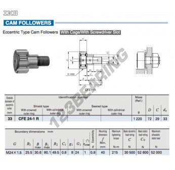 Das Kurvenrollen, bekannt als CFE24-1-R-IKO IKO, hat einen Innendurchmesser von 33 mm, einen Außendurchmesser von 72 mm und eine Dicke von 29 mm.
