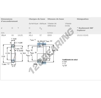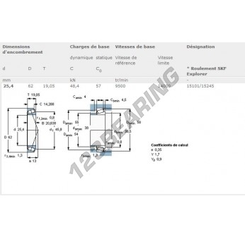 Das Kegelrollenlager, bekannt als 15101-15245-SKF SKF, hat einen Innendurchmesser von 25.4 mm, einen Außendurchmesser von 62 mm und eine Dicke von 20.638 mm.