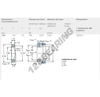 Das Kegelrollenlager, bekannt als 32040X-SKF SKF, hat einen Innendurchmesser von 200 mm, einen Außendurchmesser von 310 mm und eine Dicke von 70 mm.