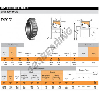 Das Kegelrollenlager, bekannt als 3576-3520-TIMKEN TIMKEN, hat einen Innendurchmesser von 41.275 mm, einen Außendurchmesser von 84.138 mm und eine Dicke von 30.162 mm.