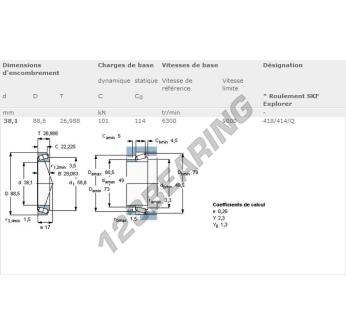 Das Kegelrollenlager, bekannt als 418-414-Q-SKF SKF, hat einen Innendurchmesser von 38.1 mm, einen Außendurchmesser von 88.5 mm und eine Dicke von 26.99 mm.