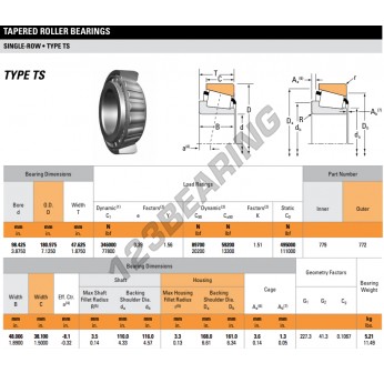 Das Kegelrollenlager, bekannt als 779-772-TIMKEN TIMKEN, hat einen Innendurchmesser von 98.425 mm, einen Außendurchmesser von 180.975 mm und eine Dicke von 47.625 mm.