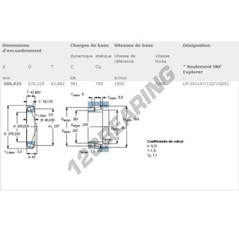 Das Kegelrollenlager, bekannt als LM241147-LM241110-VQ051-SKF SKF, hat einen Innendurchmesser von 200.025 mm, einen Außendurchmesser von 276.225 mm und eine Dicke von 46.038 mm.