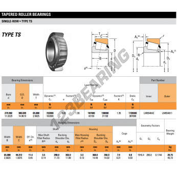 Das Kegelrollenlager, bekannt als LM654642-LM654611-TIMKEN TIMKEN, hat einen Innendurchmesser von 279.982 mm, einen Außendurchmesser von 380.009 mm und eine Dicke von 65.088 mm.