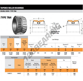 Das Kegelrollenlager, bekannt als NA66212-66462D-TIMKEN TIMKEN, hat einen Innendurchmesser von 53.975 mm, einen Außendurchmesser von 117.475 mm und eine Dicke von 73.025 mm.