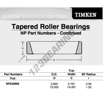 Das Schüssel, bekannt als NP235899-TIMKEN TIMKEN, hat einen Innendurchmesser von mm, einen Außendurchmesser von 72 mm und eine Dicke von 19.487 mm.