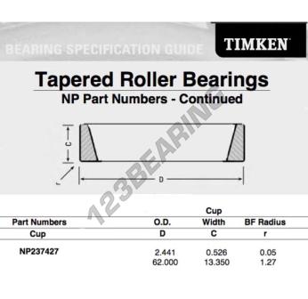 Das Schüssel, bekannt als NP237427-TIMKEN TIMKEN, hat einen Innendurchmesser von mm, einen Außendurchmesser von 62 mm und eine Dicke von 13.35 mm.