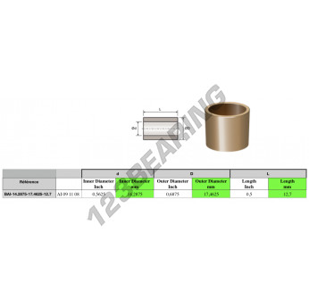 Das Bronze Gleitlager bekannt als BAI14.2875-17.4625-12.7 Generisches, hat einen Innendurchmesser von 14.2875 mm, einen Außendurchmesser von 17.4625 mm und eine Länge von 12.7 mm. Sie wird aus hergestellt.