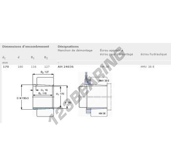 Das Spannhülsen, bekannt als AH24036-SKF SKF, hat einen Innendurchmesser von 170 mm, einen Außendurchmesser von 180 mm und eine Dicke von 116 mm.