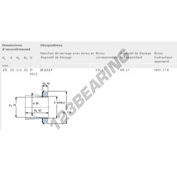 Das Spannhülsen, bekannt als H2317-SKF SKF, hat einen Innendurchmesser von 75 mm, einen Außendurchmesser von 110 mm und eine Dicke von 82 mm.