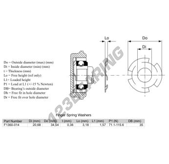 Das Federscheiben Für Kugellager mit der Referenz F1360-014 hat einen Innendurchmesser von 20.68 mm, einen Außendurchmesser von 34.54 mm und eine Dicke von 0.36 mm.